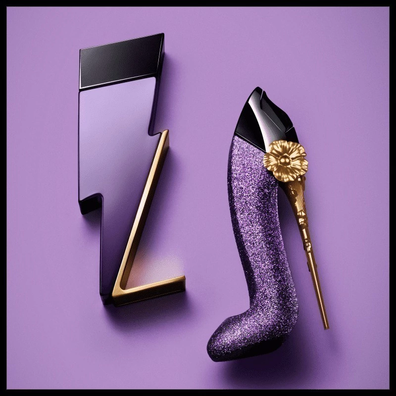 O frasco é um show à parte, já que o memorável stiletto da família Good Girl se transforma em um superstar, coberto por uma camada de brilho roxo, acabamento reluzente e flores douradas.