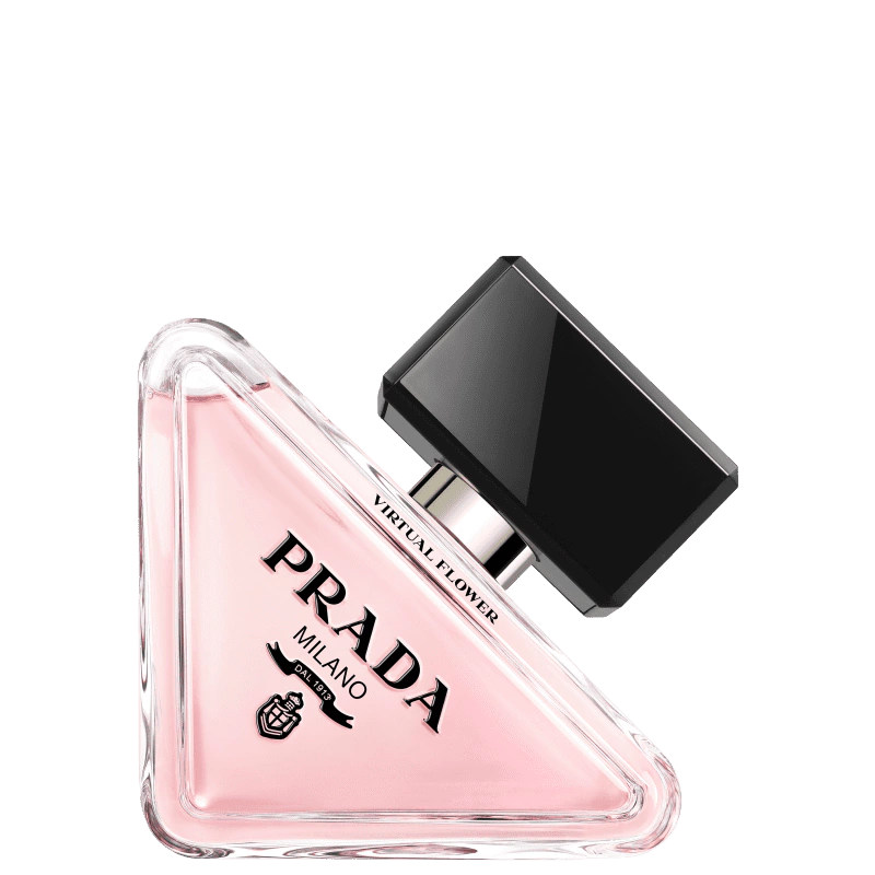 Rompendo com a arquitetura tradicional da perfumaria, Virtual Flower apresenta um design minimalista e inovador. Inspirado no icônico logotipo triangular da Prada, o frasco se destaca pela orientação lateral disruptiva. O brasão da marca contrasta harmoniosamente com o tom rosa-claro e fresco da fragrância, e a inscrição "Virtual Flower" finaliza o design com um toque sofisticado.